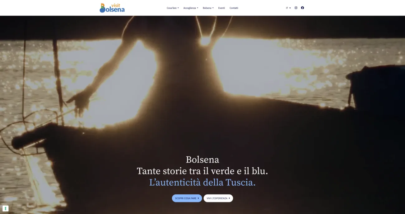 Il payoff “Tante storie tra verde e blu” è la struttura portante del sito e della sua comunicazione. La navigazione si organizza attorno a quattro nuclei tematici chiari e intuitivi che guidano il visitatore nella scoperta della città: la storia, la natura, il lago e le persone. Ogni nucleo corrisponde a un elemento chiave dell’esperienza bolsenese e costruisce un’identità riconoscibile, capace di attivare un legame emotivo con chi arriva.