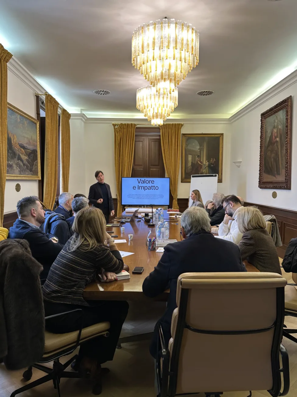 Il secondo workshop coinvolge le persone che operano all’interno della Fondazione. Nonostante le nuvole che ci inseguono nel centro di Fabriano mentre raggiungiamo la sede Carifac, l’atmosfera è accogliente e disponibile. In questa fase spostiamo lo sguardo sulle dinamiche organizzative. Anche in questo caso il confronto si struttura sul modello Valore/Impatto e ruota attorno a due poli principali: da un lato ciò che il territorio si aspetta dalla Fondazione, dall’altro ciò che la Fondazione può concretamente mettere in campo.