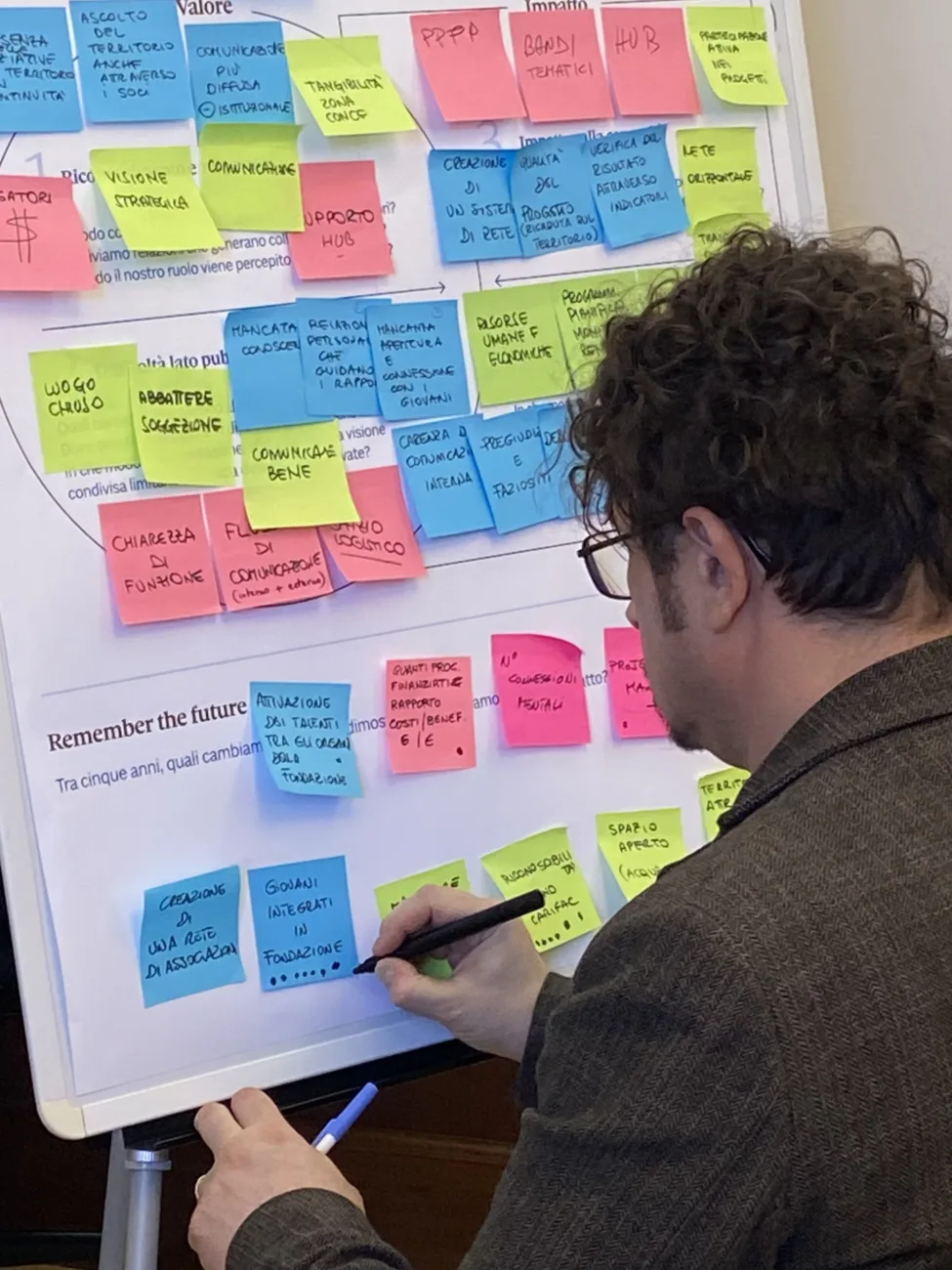 Tocca a Massimo, cofounder di Tonidigrigio che conduce questa facilitazione, proporre l’esercizio Remember the Future: invita il gruppo a immaginare che il progetto in corso sia stato realizzato con successo e a ripartire, quindi, da quel futuro possibile, ripercorrendo le tappe a ritroso per individuare le azioni più importanti.