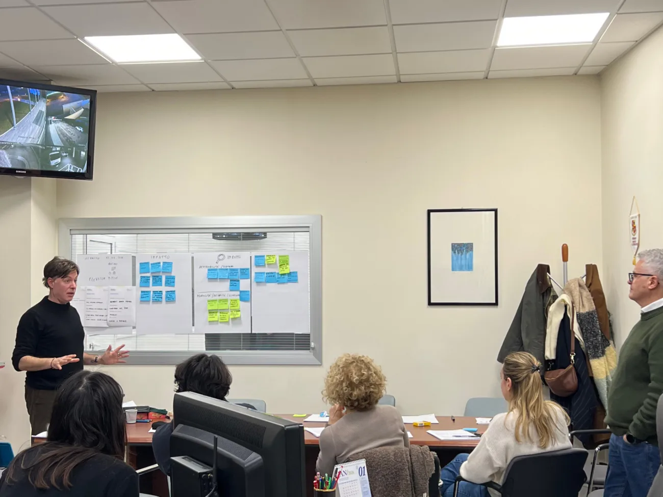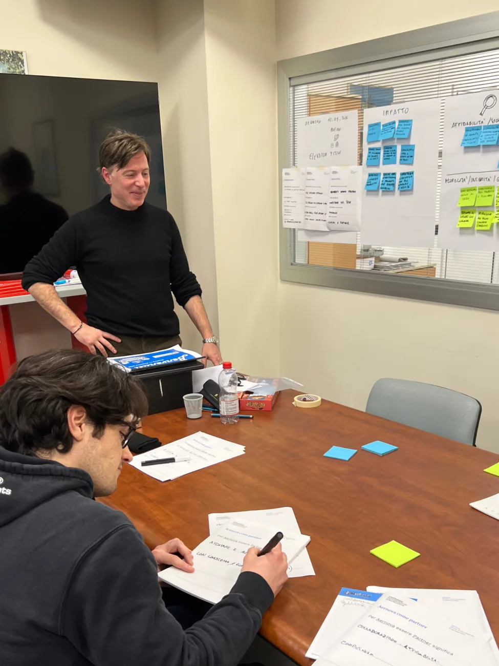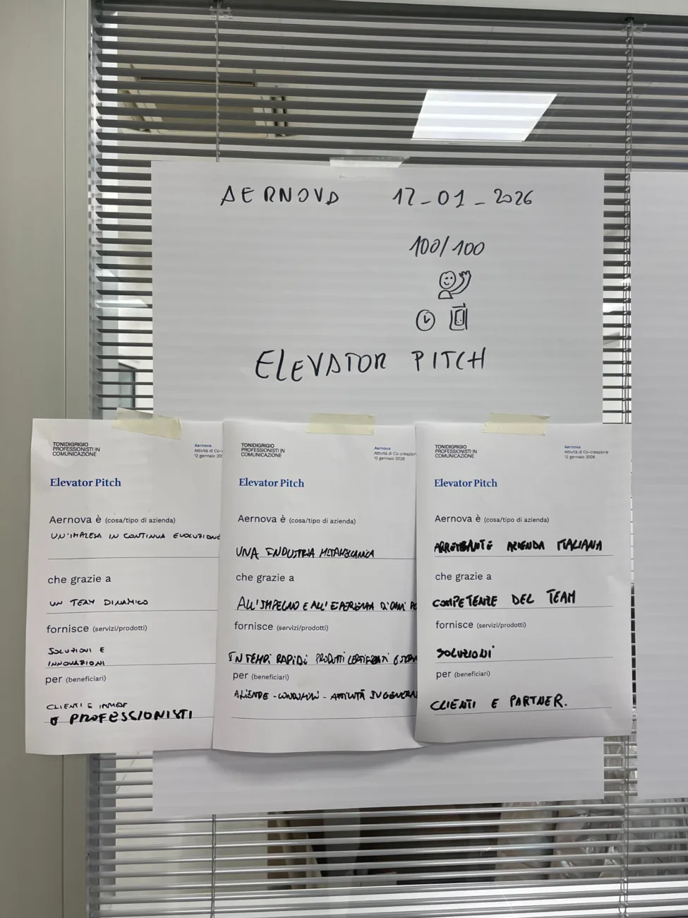 Il secondo step è quello dell’elevator pitch. Divisi in gruppi, i partecipanti generano tre differenti definizioni di AerNova, senza dover cercare la frase perfetta. Questo permette di ricavare le ricorrenze: il team si racconta spontaneamente, alcuni elementi emergono come strutturali e l’identità si mette meglio a fuoco.