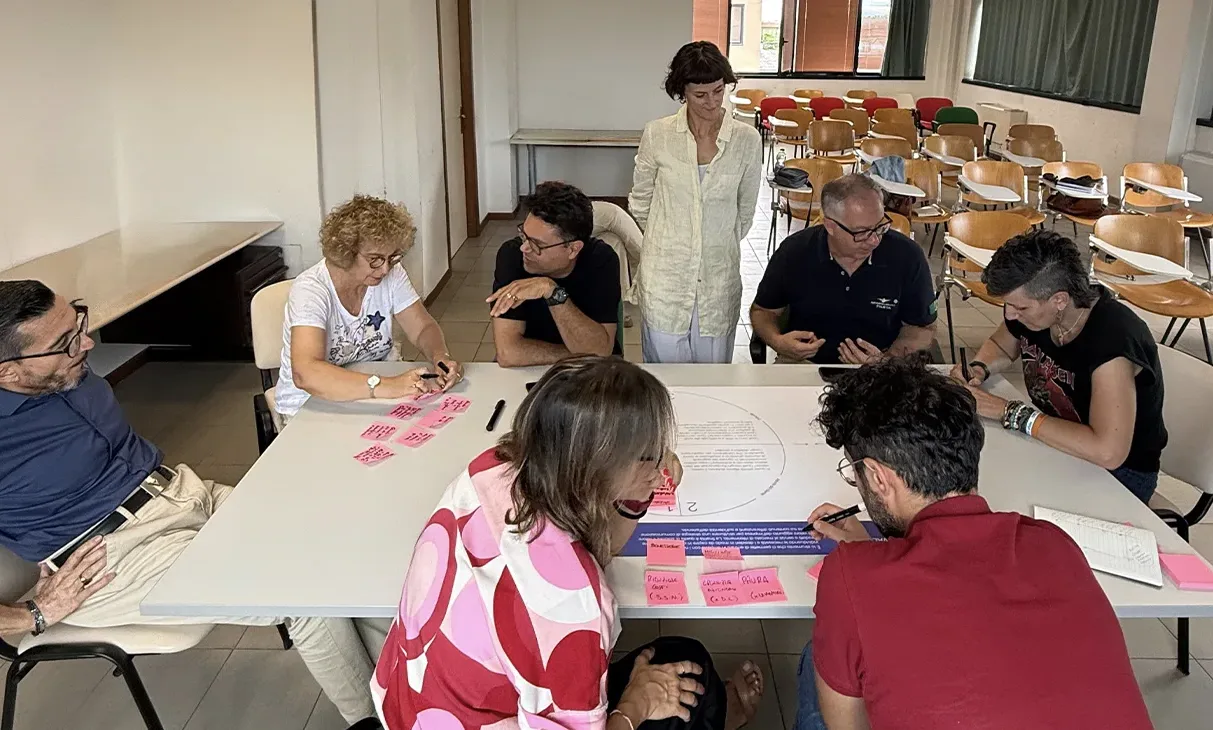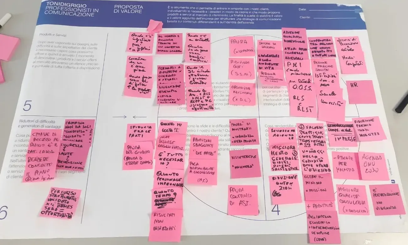 Il metodo di facilitazione di tonidigrigio coinvolge i partecipanti in un gioco con le carte Dixit: immagini capaci di far emergere attitudini, spirito e aspettative attorno al progetto video. Successivamente, attraverso il Value Proposition Canvas, si lavora sull’identificazione del valore del PP3: chi sono i beneficiari finali, quale servizio raccontare, quali aspettative o resistenze potrebbero emergere. Da questo confronto nasce una proposta che mette al centro il valore aggiunto del progetto.
